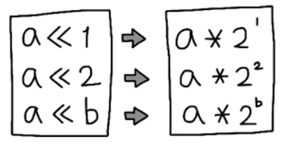 곱하기 2를 해도 되지만 이진수를 왼쪽으로 한 번씩 이동시켜주면 기존 값의 두 배가 된다.